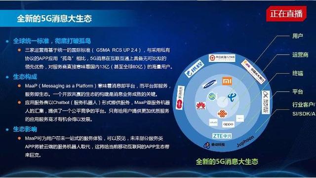 在RCS上试点最久的中国移动在此次直播里提到了三个重点:GSMA已经将RCS纳入5G终端的必选功能;相比传统短信,5G消息是多媒体消息、商业类消息、智能化消息和互动式服务、安全防伪等新体验,可实现“消息即服务”;5G消息需要产业链上下游共同推动,包括技术研发、应用推广、成果转化等,终端企业、平台服务商、内容服务商等都需要一起加快推进。