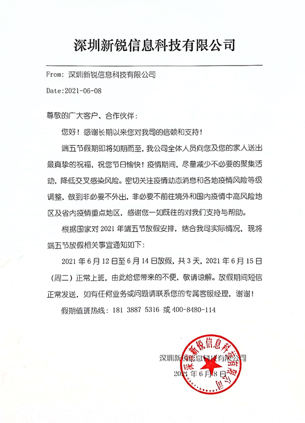 关于新锐公司2021年“五一”劳动节放假的通知
