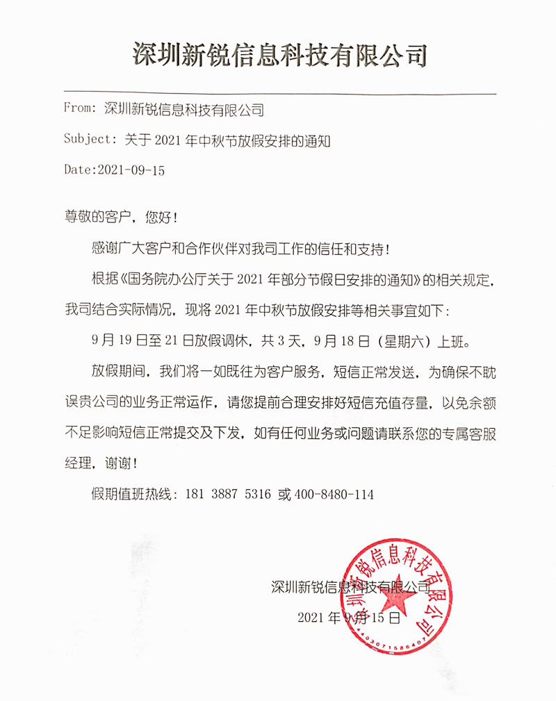 放假期间,我们将一如既往为客户服务,短信正常发送,为确保不耽误贵公司的业务正常运作,请您提前合理安排好短信充值存量,以免余额不足影响短信正常提交及下发,如有任何业务或问题请联系您的专属客服经理,谢谢!